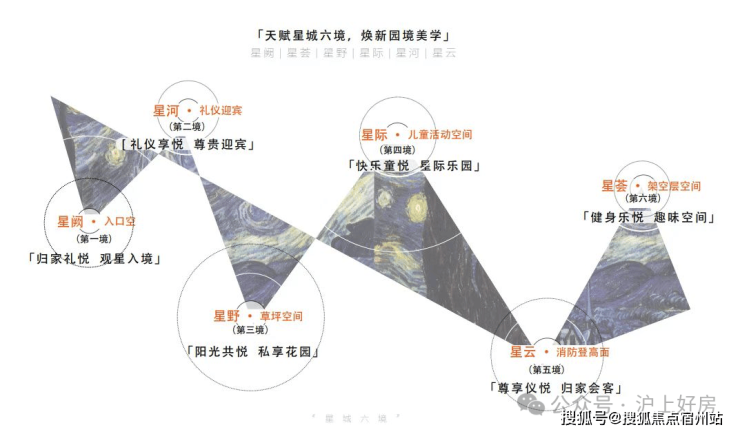 社区方面景观方面, 项目以现代手法结合传统精髓的创新设计与纯净的星空相互融合, 将建筑、文化、艺术与景观完美交融。筑造出星阙、星荟、星野、星际、星云、星河六大盛境,营造中央景观 “景阔似海、品如繁星” 的高品质人居环境。