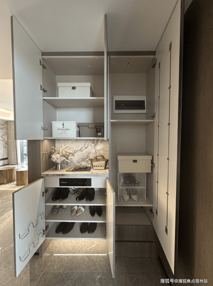 建面约144㎡洋房,一梯两户,电梯双开门, 玄关位置,单独做有储藏空间,可以将大件的行李箱、滑板车等等置入: