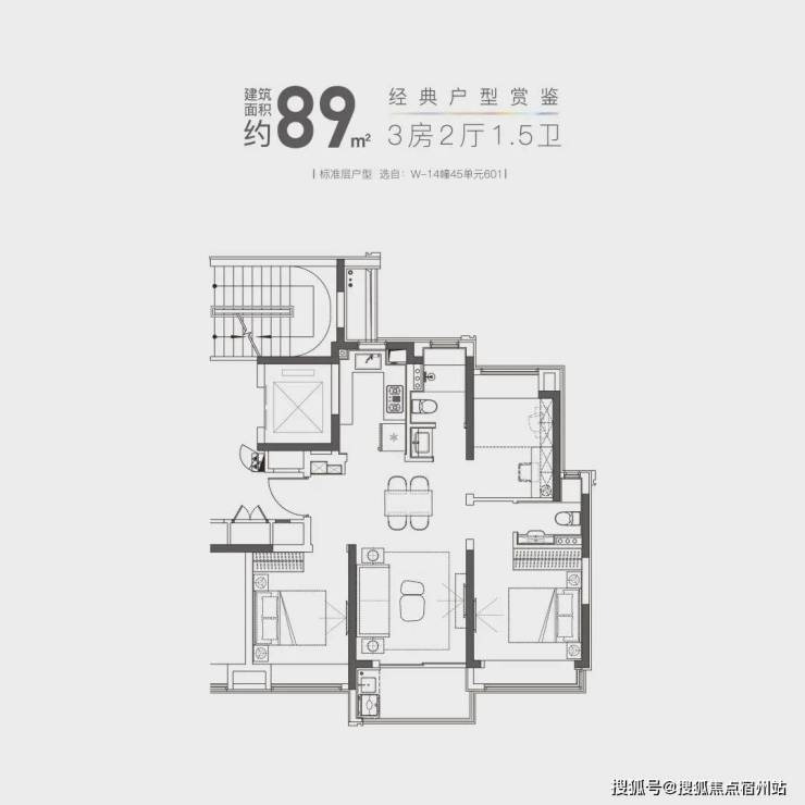 建面约89㎡的户型,绝对是小户型里的"豪宅"代表!三开间朝南,全卧室带飘窗,室内采光、视野和空间延展性都堪称一流。更神奇的是,这款户型居然没有走廊和拐角,一梯两户设计让得房率直线上升。在这样的布局下,竟然还能容纳下一个1.5卫的设计,既保证了主人的私密空间,又避免了早高峰用厕的尴尬。