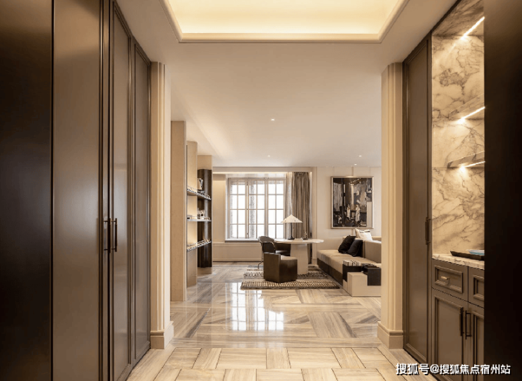 进入室内的 入户玄关 收纳空间, 地面采用静雅棕、宝格丽兰石材拼花 设计 , 古典回形波打+实心铜条 的搭配增强入户尊贵感。右侧是 山水白奢石的开放格 ,左侧是行李间,通过暗门的做法,将功能结合进去,强化了归家的仪式感。