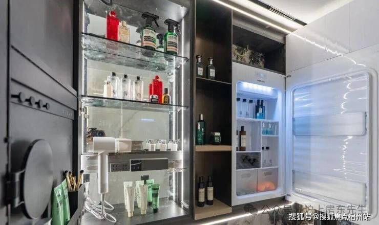 值得一提,保利戳中女性需求,主卫新增 科勒美妆龙头 ,水流角度贴合化妆、护肤需求;主卫镜柜嵌入 美妆冰箱 ,贴心存储口红、面膜等护肤品。
