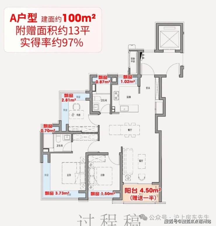 该户型满配6飘窗,比常规户型多2个卫生间飘窗、1个厨房飘窗;再加上阳台送一半面积,经过测算总赠送约9.3平,相当于一间次卧。
