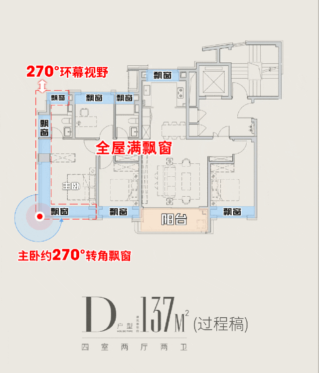 而且你仔细看,这个户型突破常规百平三房的尺度, 主卧、北次卧都带270°转角飘窗。