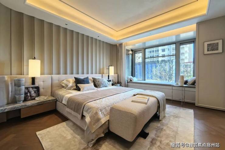 主卧采用弧形皮革背景墙,肤质的手感摸着很舒服 ,也很有层次感,主卫更加是把奢华感全部拉满, 双台盆、临窗的浴缸,设计感极强。
