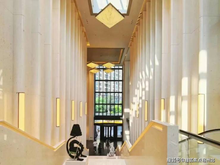 大堂整体挑空14.5米 ,两侧通体象牙质地色泽的大理石铺面,结合竖向灯带, 归家的仪式感被拉满。