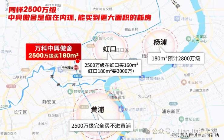 于2500万级购房者,同价位下, 中興傲舍建筑面积约180㎡大三房,比虹口、杨浦新盘多出约20㎡空间。要知道,虹口同面积段新盘总价已冲到3000万+。