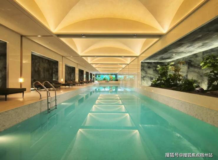 其中, 上海首个植物园泳池 以皮革面绿色石材营造树影斑驳的秘境氛围: 泳池尽头布满真实绿植,墙面选用了绿野仙踪的皮革面绿色石材, 营造出一种树影斑驳的都市度假感,更可以与自然的绿植零距离接触。