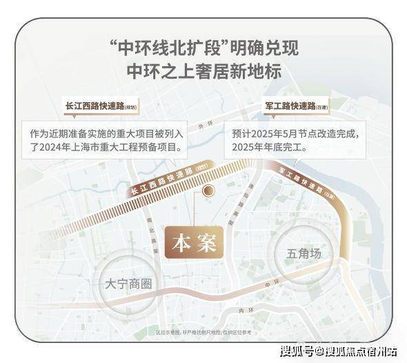 中环线北扩段明确兑现,军工路快速路25年开工,长江西路快速路列入上海市重大工程清单预备项目,快速链通城心,随着中环线北扩段的政策明确,淞南将正式进入中环时间。未来经逸仙高架,进入南北高架、内环高架、中环高架,可快速链通南北上海;多维立体路网全面升级,未来区域价值再攀新高。