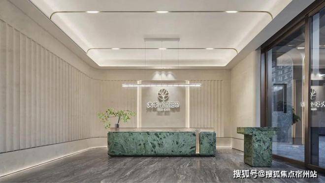 大堂接待台选用产自 意大利山脉的宝格绿奢石一体打造而成。