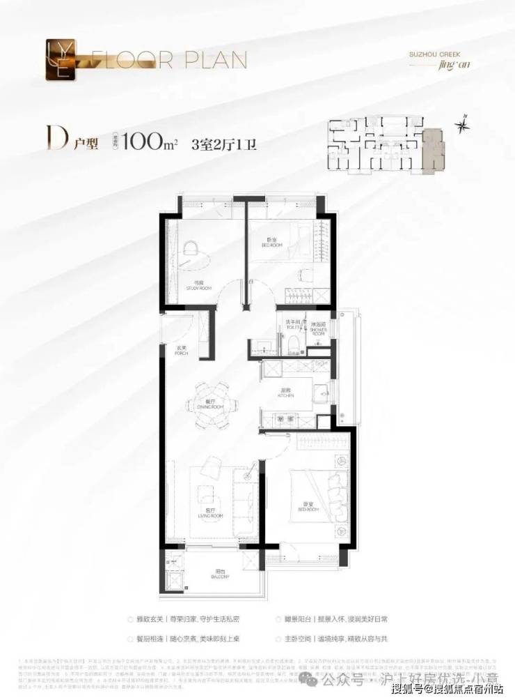 建筑面积约100㎡3房D户型:南北通透的设计让该户型拥有更加优秀的通风效果。而且这个户型做到了全卧飘窗(3个飘窗)+南向瞰景大阳台,丰富的灵动空间提升了实得面积!