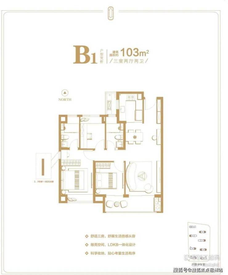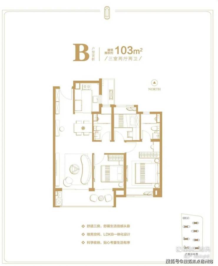 主力约103㎡3房2卫,经典LDKB餐客厨阳一体化贯通中轴的设计,极力减少过道、转角等空间浪费,撑起气场的同时,也提升了户型的实用性、家庭成员的互动性和场景感。