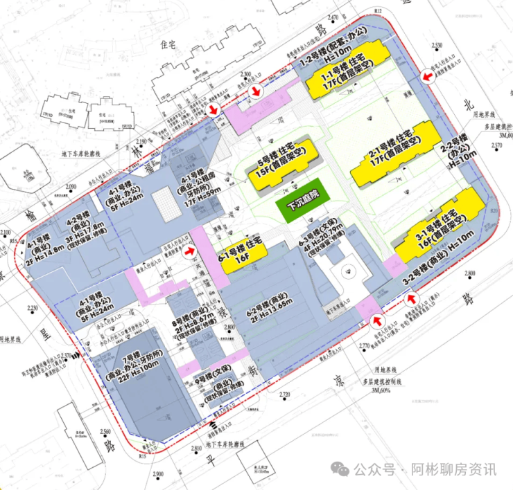 项目总建筑面积约66.3万方,一共10块地,其中住宅有两块;住宅部分规划有4栋超高层住宅,其余均为3层别墅产品。