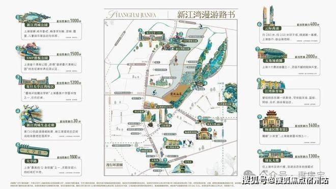 「1网」·新江湾城慢⾏⽹:基于6横4纵河道布局,构建出门见绿、移步即景的步行体系。