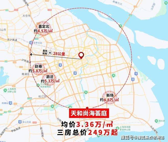 项目直线距离人民广场约28公里,我们以相同半径画圈,✅✅天和尚海荟庭售楼处电话➡☎:400 - 8824 - 258✅✅同一纬度的圆周板块,新房价格普遍超过5万/㎡