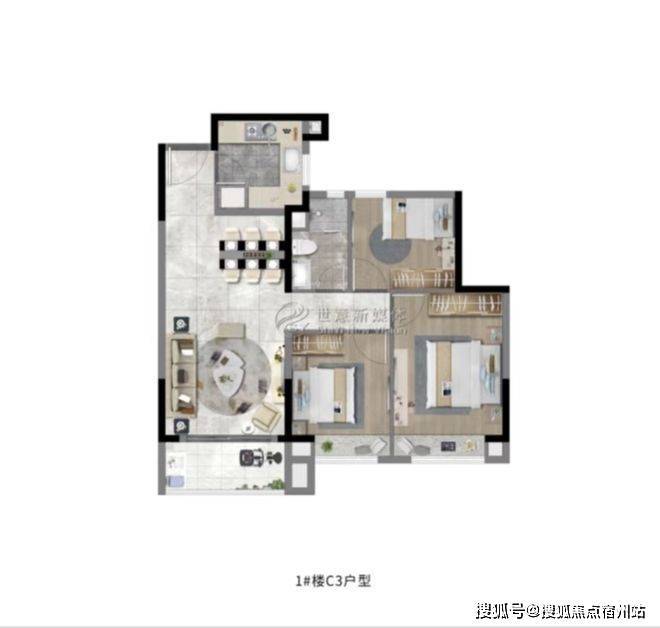 建面约108㎡3房2厅2卫,做到了三开间朝南+双阳台设计+主卧套房设计+南北通透,该户型得房率非常高。