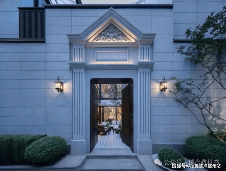 组团入口设置高景墙,运用传统漏窗“框景”手法过滤外部视线;入户门窗错开,进一步加强了私密感,营造出“庭院深深深几许”的大隐隐于市的氛围。