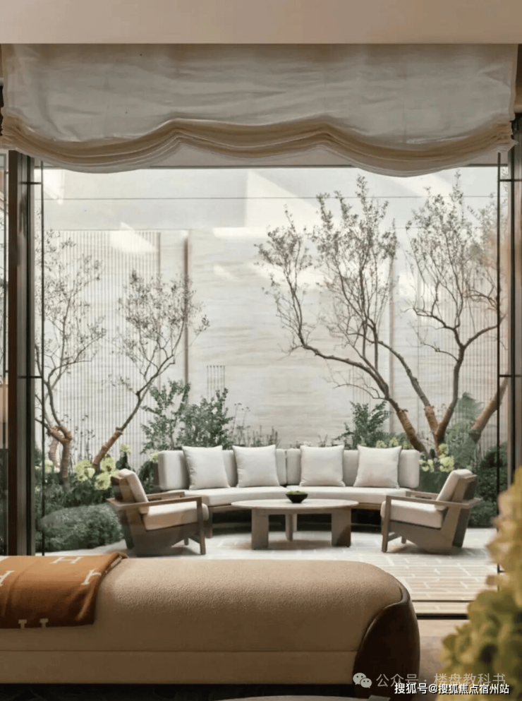 通过客厅与庭院大尺度落地窗门的开启,客餐厅与庭院景观互相延展,生活场景向内展开。