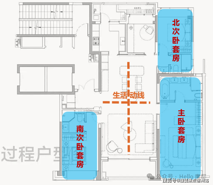 南向双套房+北向类套房设计,使三个房间分散于房子的三个方位,内部私密性十足。