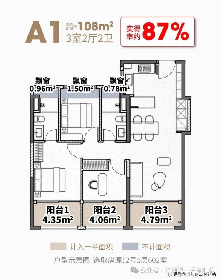 阳台+飘窗算下来,约108㎡户型的实得率达到了惊人的约87%,实得面积约94㎡!