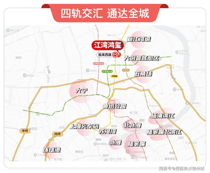 四区交汇的战略级区位:项目行政归属宝山,但实际紧邻杨浦五角场、虹口江湾、静安彭越浦三大成熟区域。距 五角场商圈直线距离约3公里,可便捷享受其顶级商业、文化与教育资源。这种“一脚踏四区”的格局,让业主能最大化地汲取各区域的发展红利。