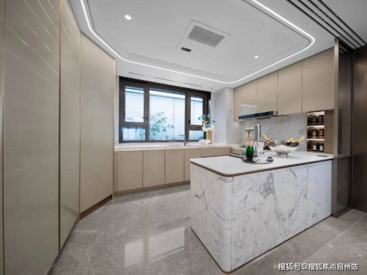 甚至, 厨房的面宽也达到了约4.55米,超过主卧的面宽。独特的G型设计,串联起中西厨,岛台还贴心的做了加高处理。