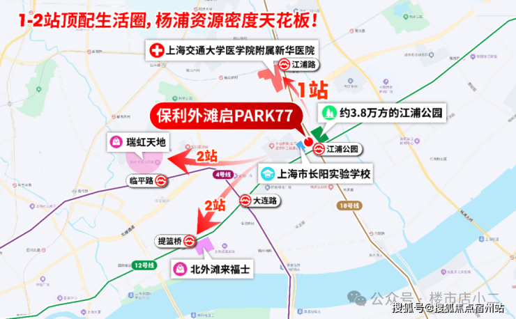 保利外滩启PARK77坐落于杨浦区内环核心区域,距离 12号线与18号线交汇的江浦公园站仅约50米,是真正意义上的“双轨交上盖”项目。从这里出发,2站即可到达北外滩,7站直达南京西路,8站抵达陕西南路,18号线往北3站便是复旦大学。