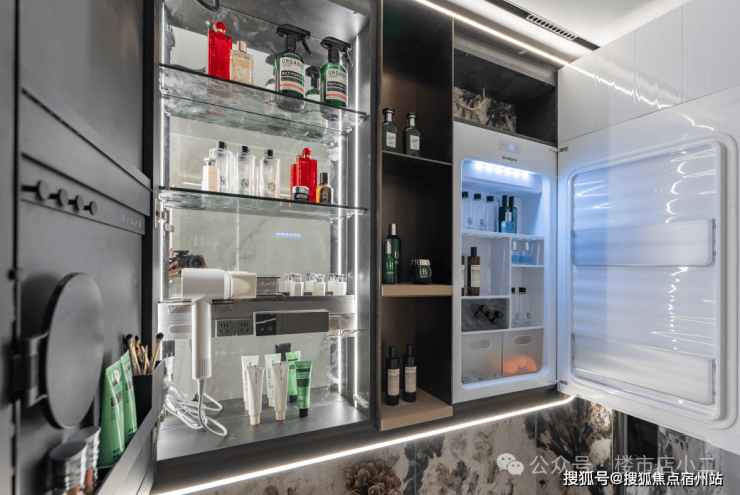 主卫镜柜嵌入美妆冰箱,贴心存储口红、面膜等护肤品