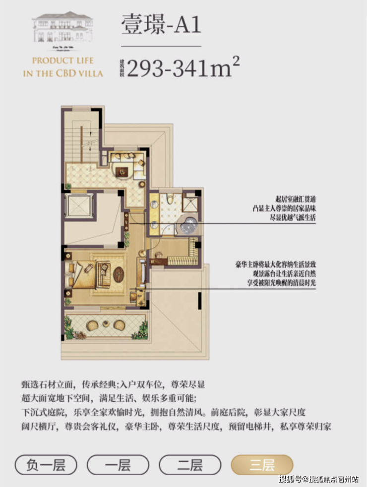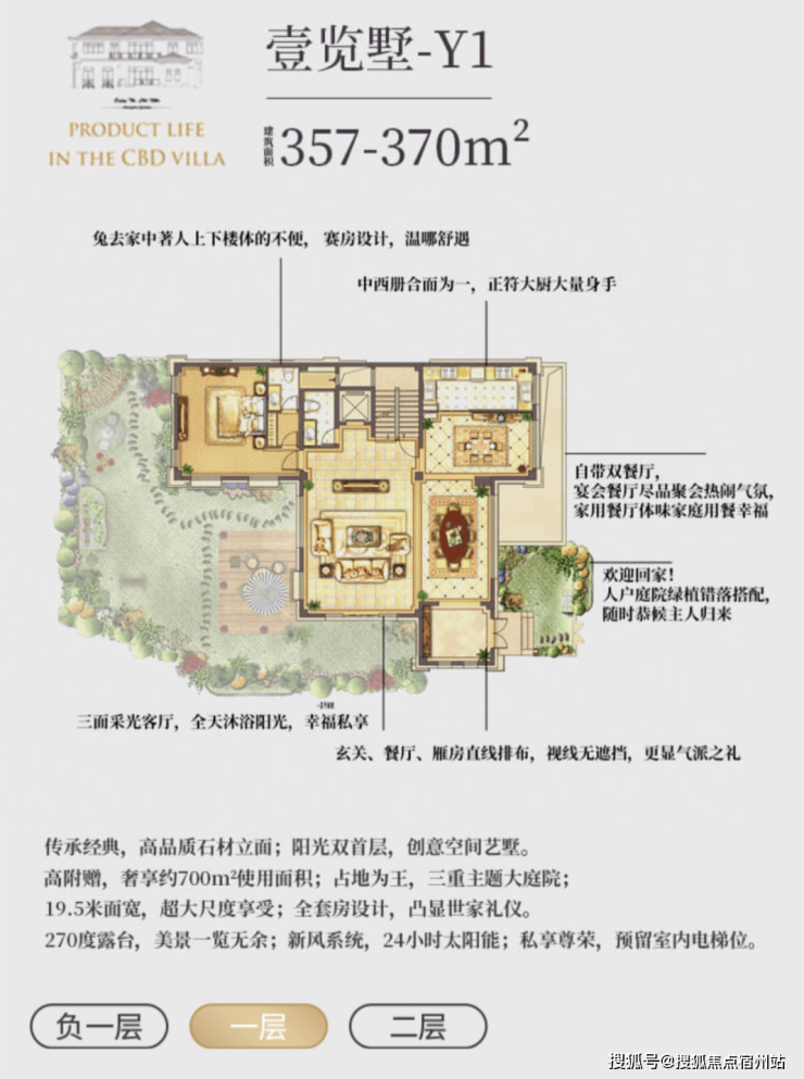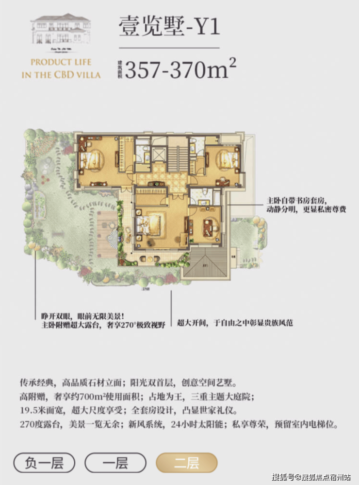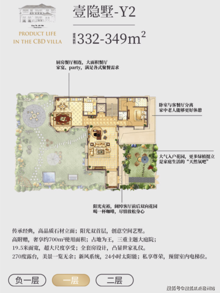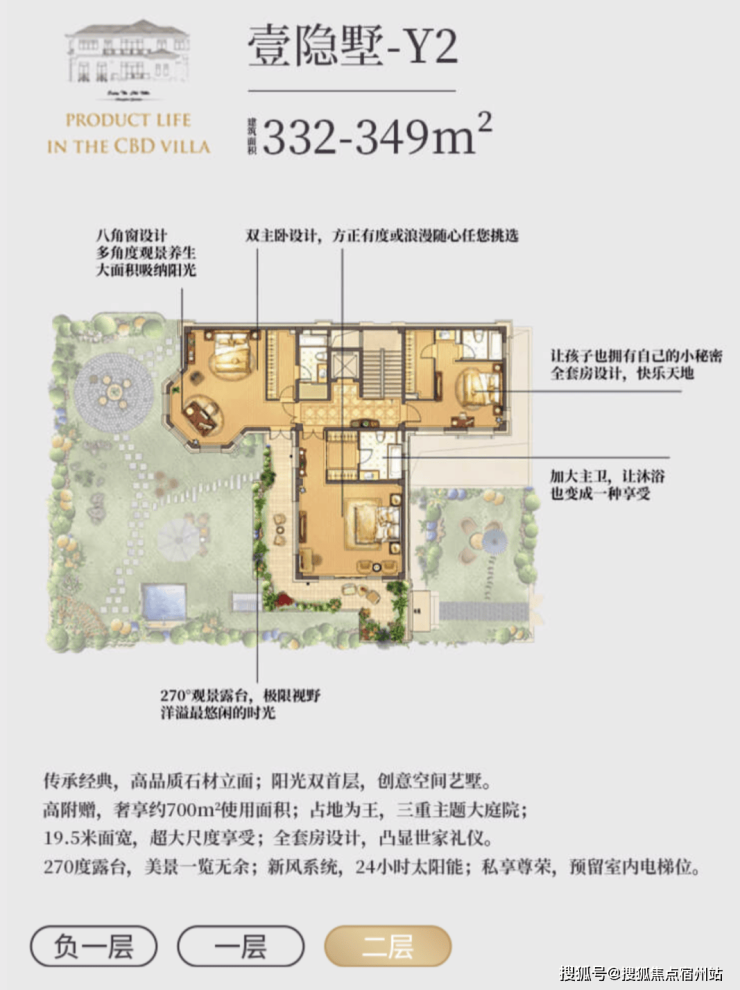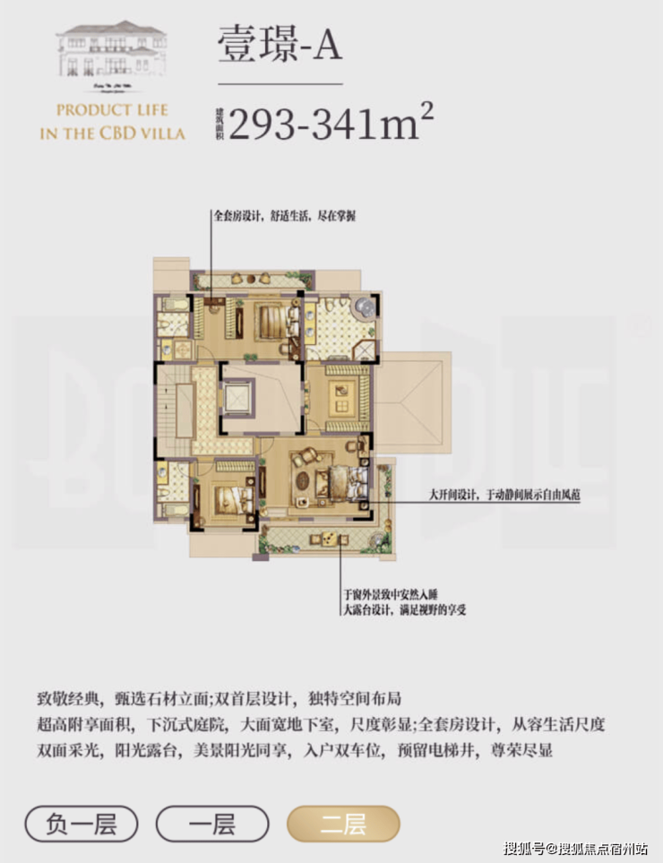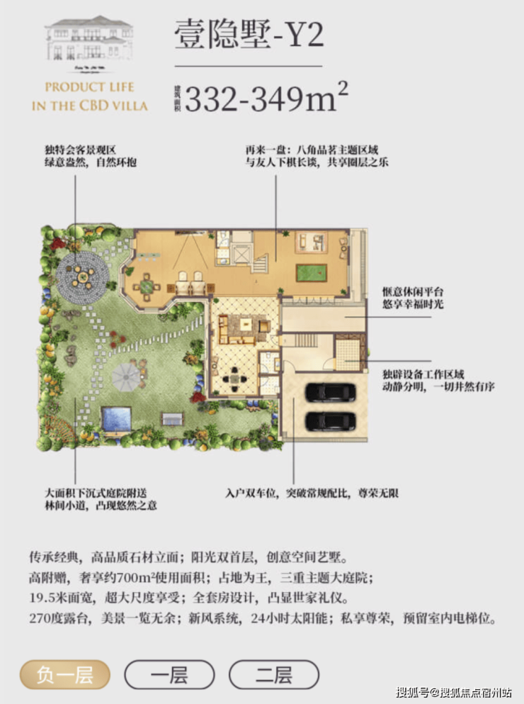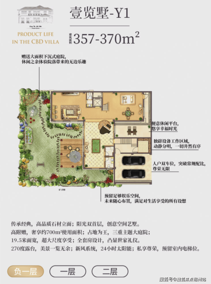 l 超值附赠空间,约在 330~370 ㎡建筑面积,使用面积达到将近 700 ㎡;l 低密墅区自由呼吸,约 0.7 容积率,近 40%绿化率;l 贝尔高林景观设计,S 型坡道规划,一步一景,四季异景;l 精工宽景别墅,真石材真釉屋面,历久弥新浪漫典雅;l 安全无扰的出行环境,双匝道的设计,独立保安岗亭守卫;l 双首层设计,全明地下空间,车库直接入户,通风透亮更惬意;l 双花园设计,兼得下沉式私家花园及入户花园,多重生活享受;l 大理石贴面打造围院,私密入户彰显尊贵;l 超大面宽客厅,3.6 米层高,大气格局视野开阔;l 四套房朝南主卧,L 型设计景观互动露台,互通有无。