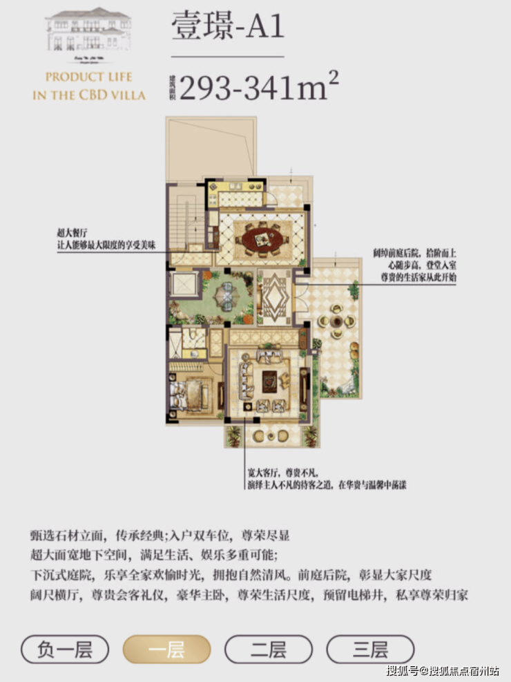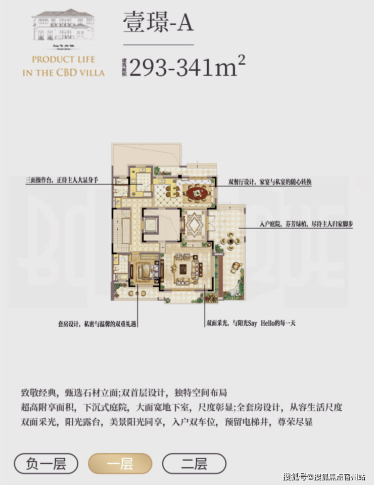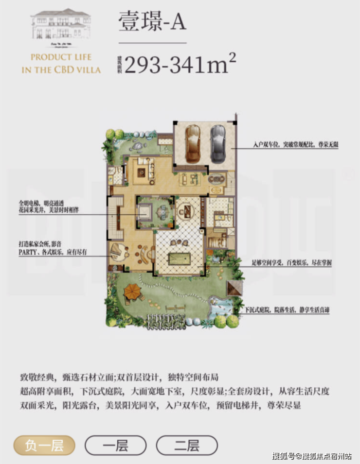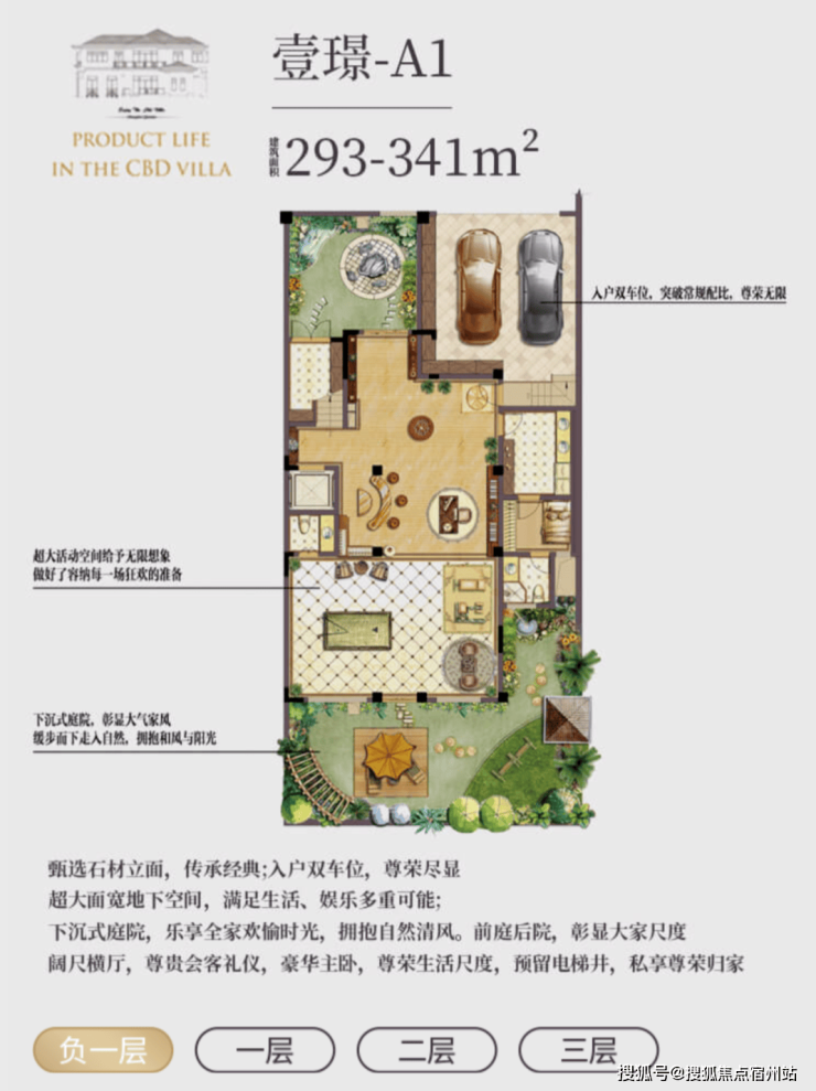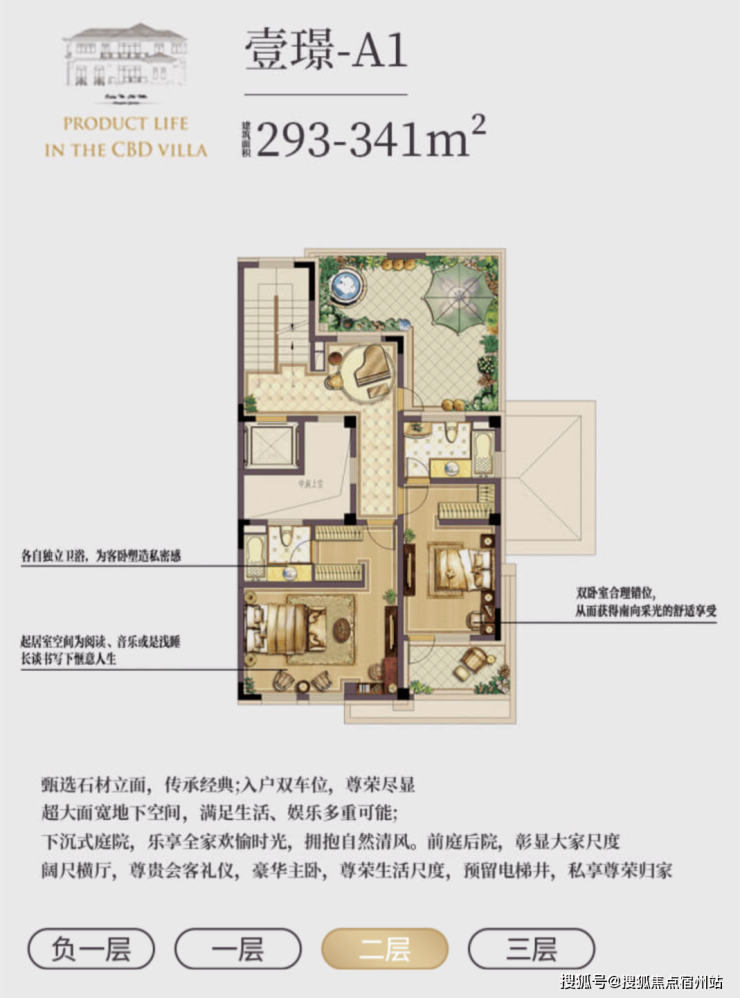 l 超值附赠空间,约在 290~340㎡建筑面积,使用面积达到将近 600 ㎡;l 低密墅区自由呼吸,约 0.7 容积率,近 40%绿化率;l 贝尔高林景观设计,一步一景,四季异景;l 精工宽景别墅,真石材真釉屋面,历久弥新浪漫典雅;l 安全无扰的出行环境,双匝道的设计,独立保安岗亭守卫;l 双首层设计,全明地下空间,车库直接入户,通风透亮更惬意;l 双花园设计,兼得下沉式私家花园及入户花园,多重生活享受;l 大理石贴面打造围院,私密入户彰显尊贵;l 超大面宽客厅,大气格局视野开阔。
