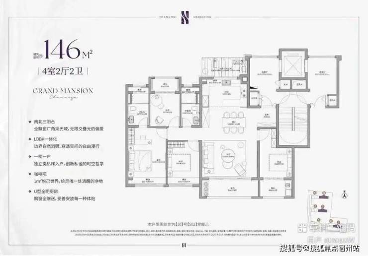 建面约143㎡的4房户型, 类一梯一户的设计,每一户都有一个面积约8㎡的独立采光电梯厅空间;四开间朝南+大宽厅,采光效果爆棚;通过LDKB一体化设计,形成一个近50㎡的客餐厅空间,极大提升空间场景的可能性;卧室也采用了酒店化套房设计,主卧贯穿南北套房设计,南北皆有飘窗。