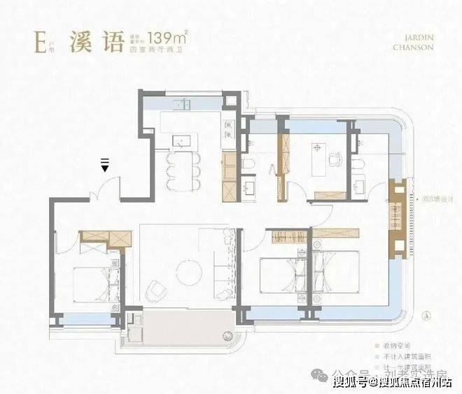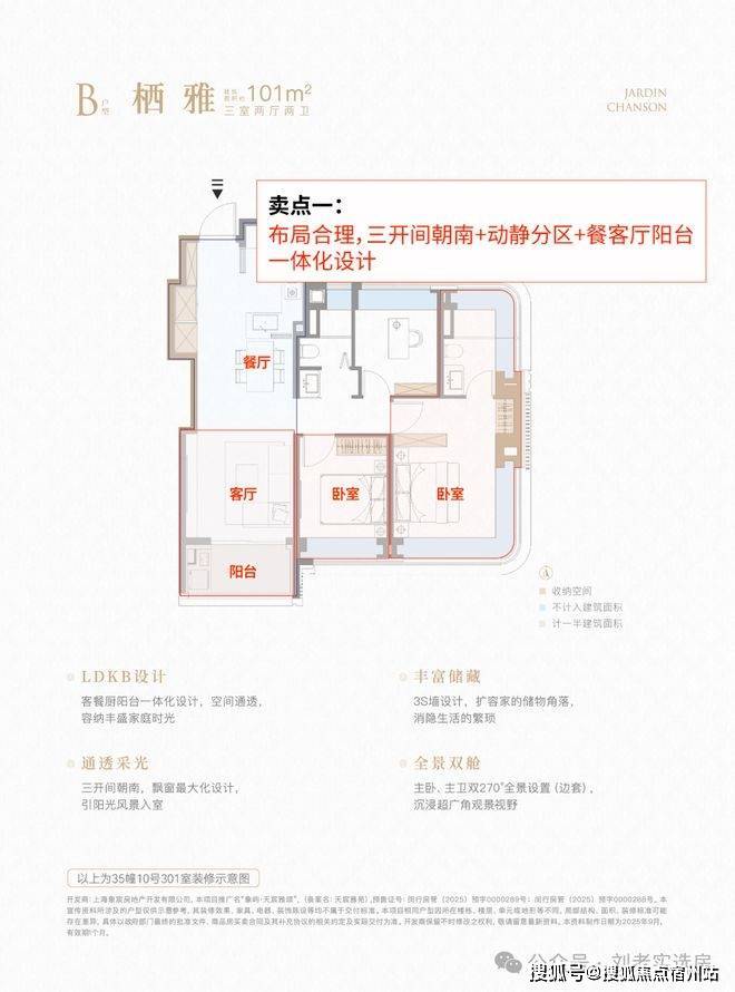 建面约101㎡边套户型,首先布局相当合理,三开间朝南+动静分区+客餐厅阳台一体化设计,采光、私密性和空间利用率全部拉满,3房2卫的配置也非常符合市场主流需求。其次,大量S墙的设计简直见缝插针,极大的扩容了家的储物角落,消减了业主生活的繁琐。