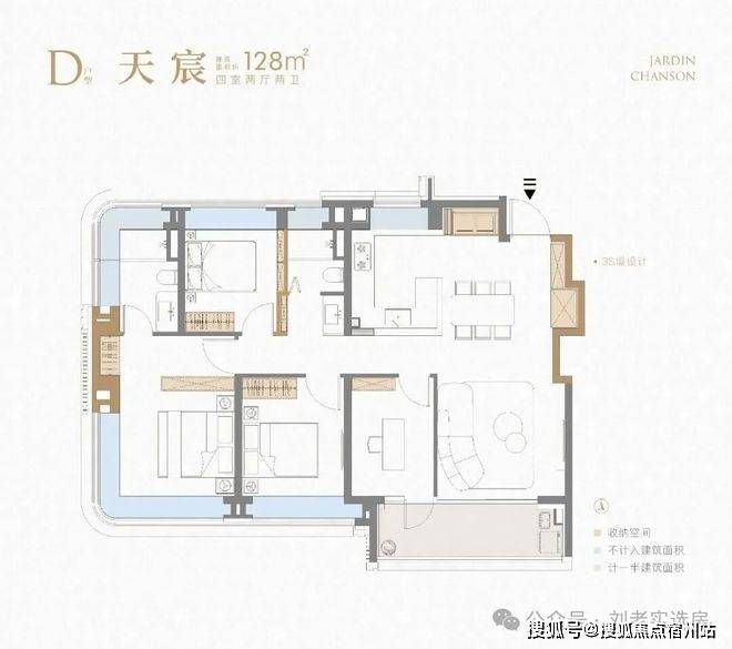 建面约128㎡户型则是做到4房2卫的功能性,适配市面上越来越多的二胎或三代同堂家庭。格局上进化为南向四开间,保证了更充沛的阳光。客餐厅+超大尺度阳台贯穿南北,进门视野无遮挡,大宅气度油然而生!