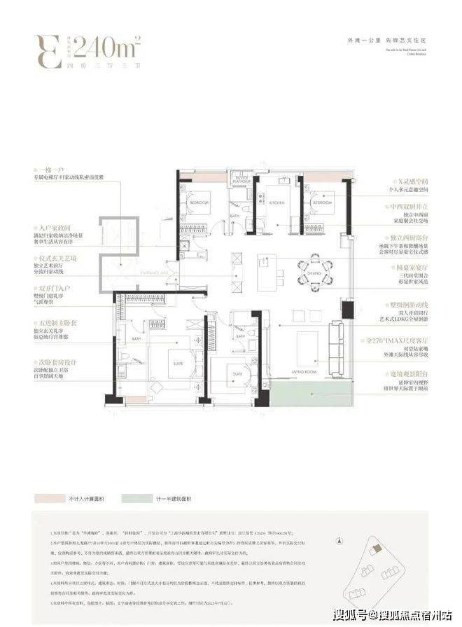 大横厅尺度感奢阔,尊享私梯入户,隐私性满分!三间卧室朝南设计的平权户型,老人、小孩均可享受南向采光;厨房转角窗、主卧套房、北向书房均配置270度转角飘窗,景观视野相当不错!次卫四分离设计,相当人性化~
