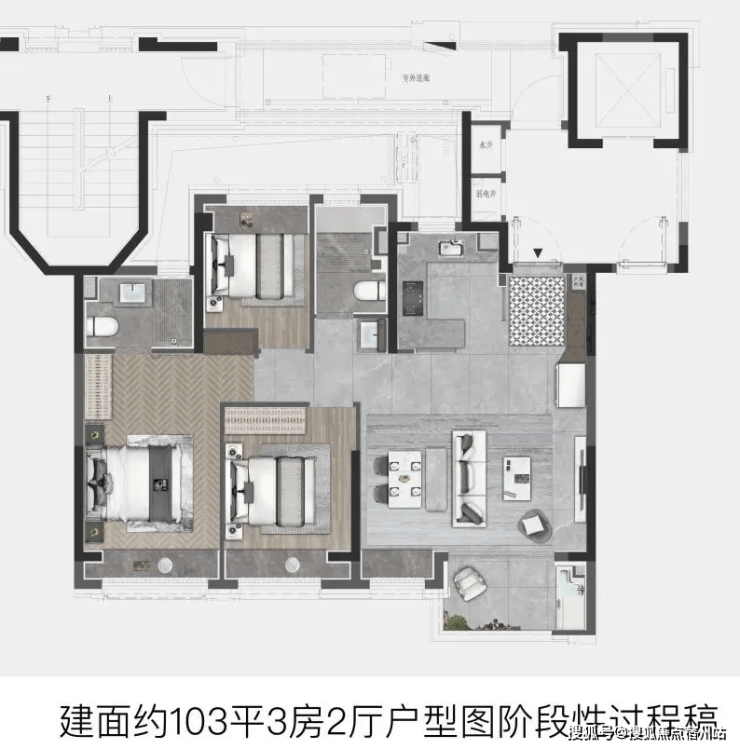 这套建面约103㎡ 动静分离户型 打破常规,兼具 三个房间和南向超阔面宽的横厅 ,以此承载从二人世界到三代同堂的全生命周期需求。