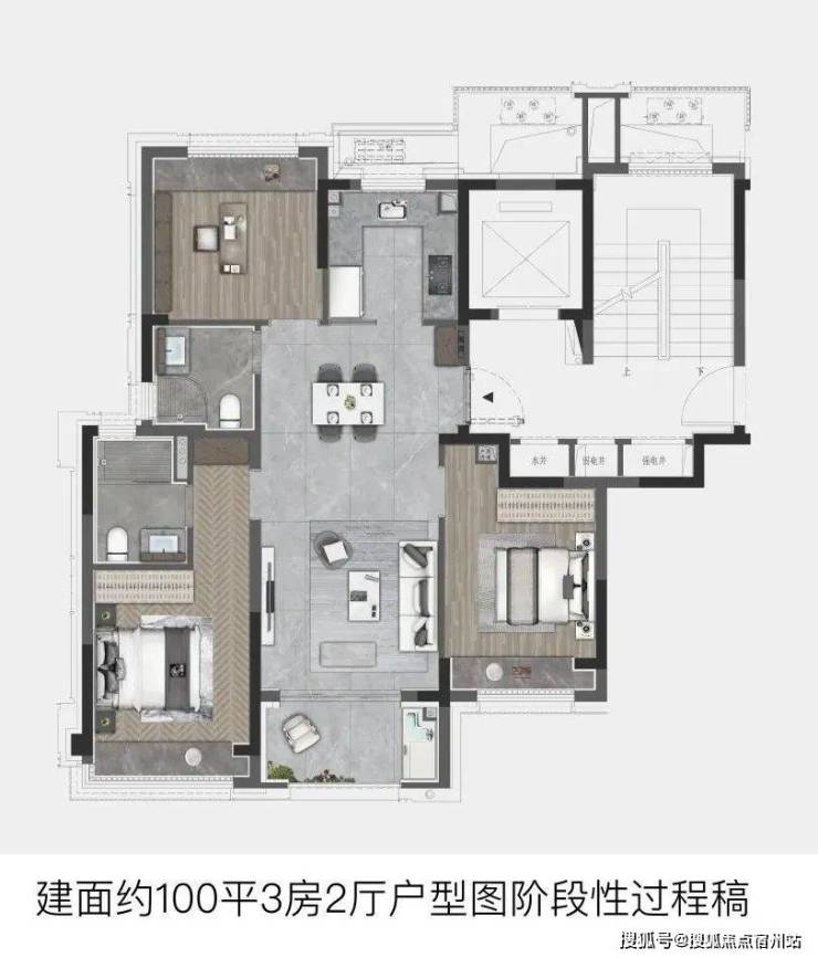 另一套建面约100㎡飞机户型 ,同样做了三房两卫,户型方正,几乎无过道设计,每一寸空间都没有浪费,舒适不局促。