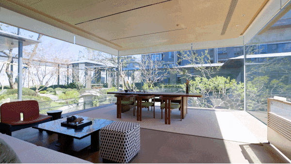 三面悬挑的玻璃结构,凌空架在水景之上。静坐其间,松风拂面,目光 穿过通透的玻璃,便能看见层层庭院的绿意与水韵 。喝茶,不只是喝茶,而是一次与天地对话的体验。