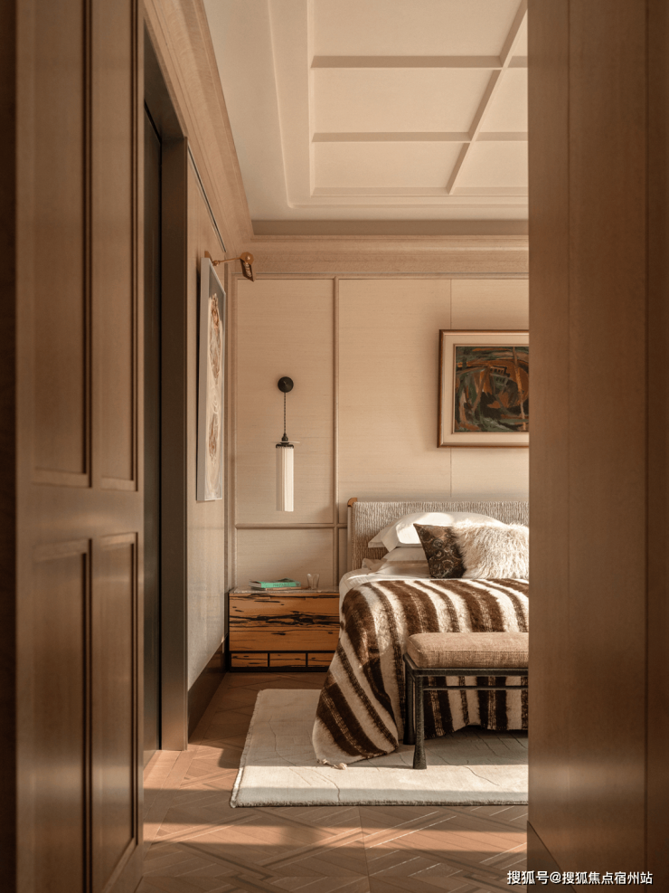主卧床屏后结合屏风与窄床背,以对称形式建立空间的秩序骨架。