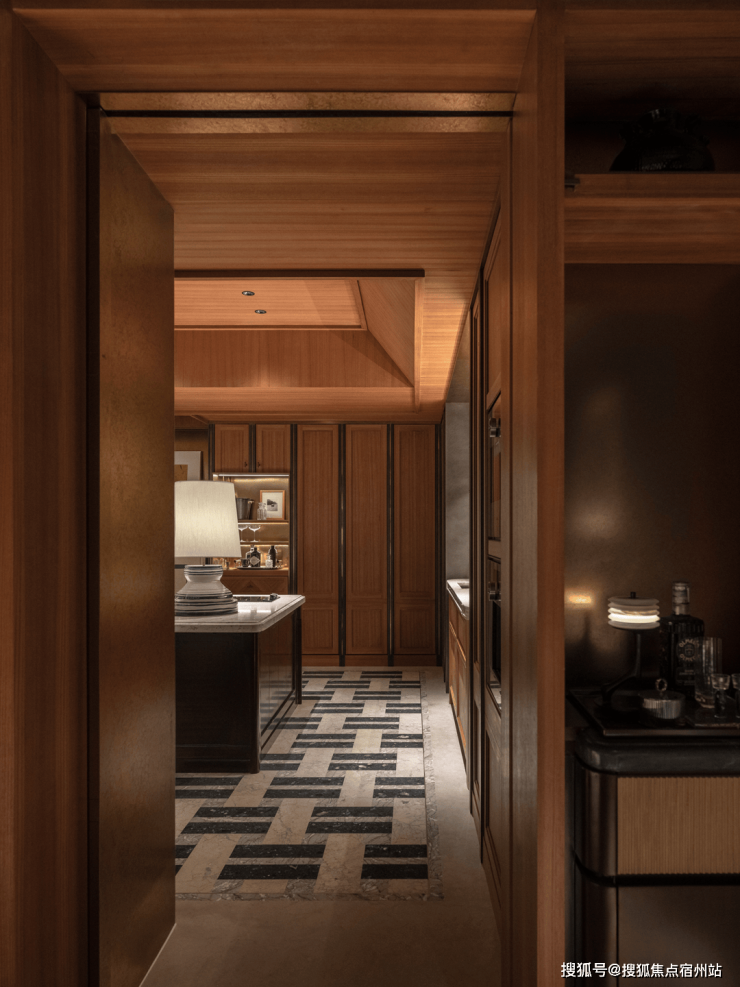 整体布局采用向心式的“打开”策略,会客区使用木地板拼花,私宴区则使用更符合场景的石材拼花。