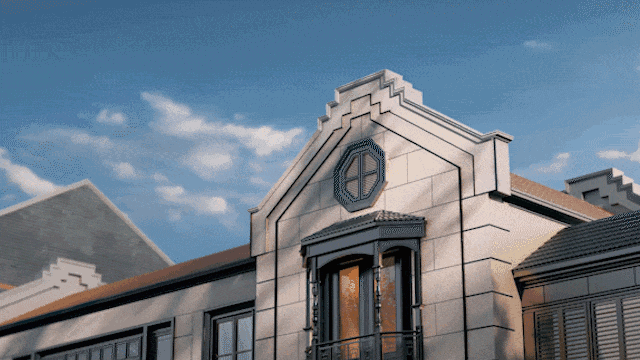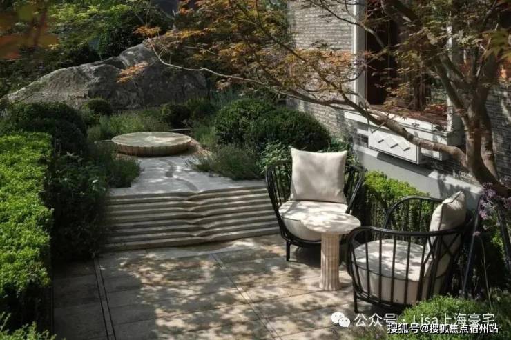 从庭园看向别墅,保留的老山墙、砖楣和门头,再加上悬挑阳台和层层露台,这种传统风貌带给人一种重见历史的感慨,又有温馨、宁静的现代舒适感。