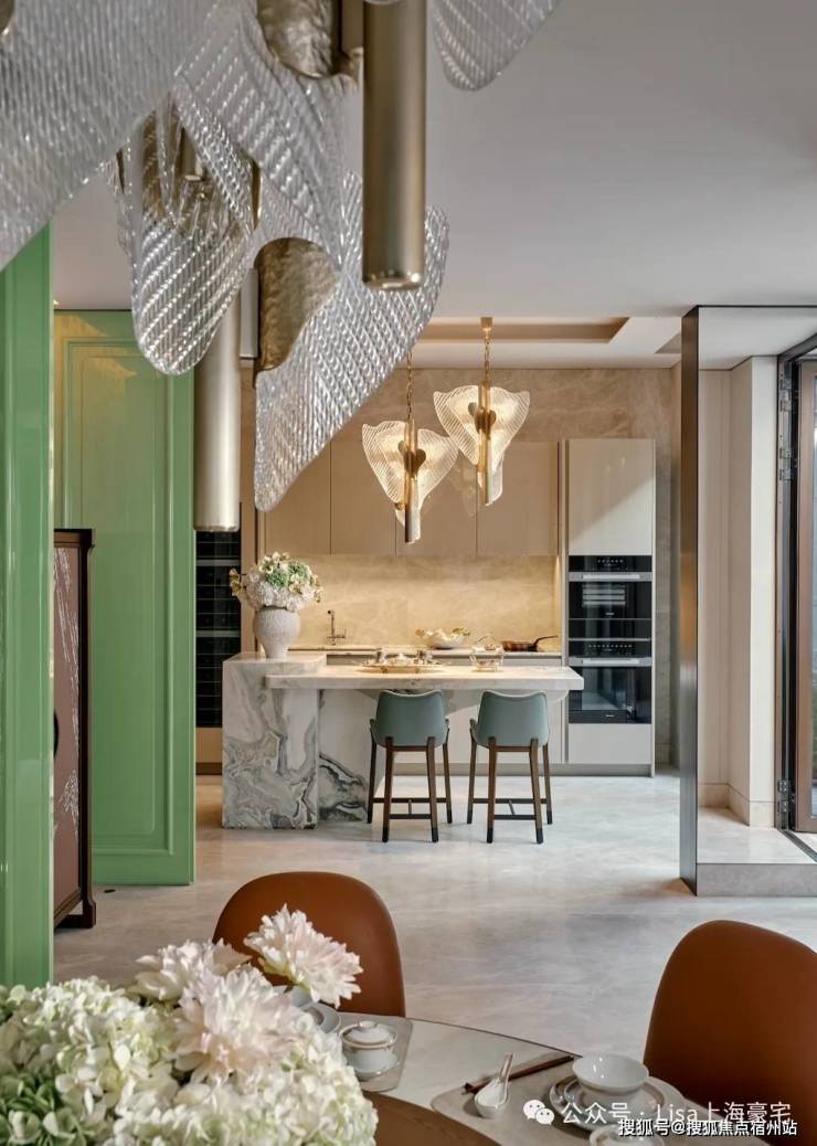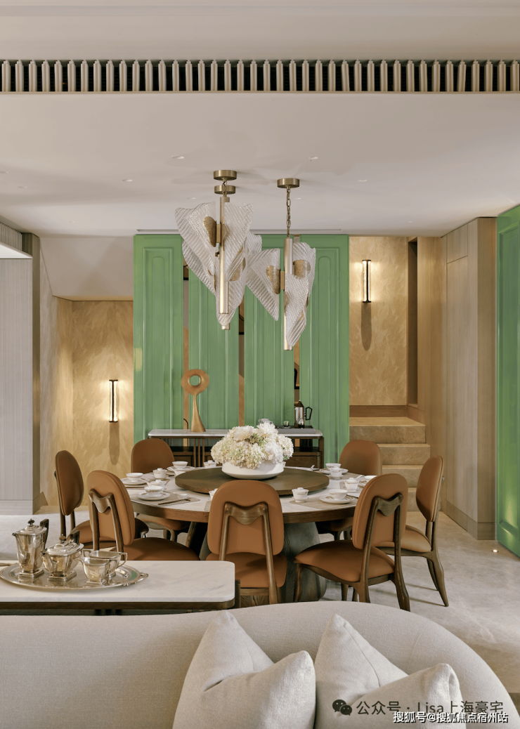 餐厅的设计巧妙融合了老上海的经典元素,圆形餐桌和橘色皮质餐椅在色彩上既现代又充满活力,顶部的水晶吊灯造型灵感来自上海市花“玉兰花”,既增添了空间的华丽感,又巧妙地融入了上海的地域特色。
