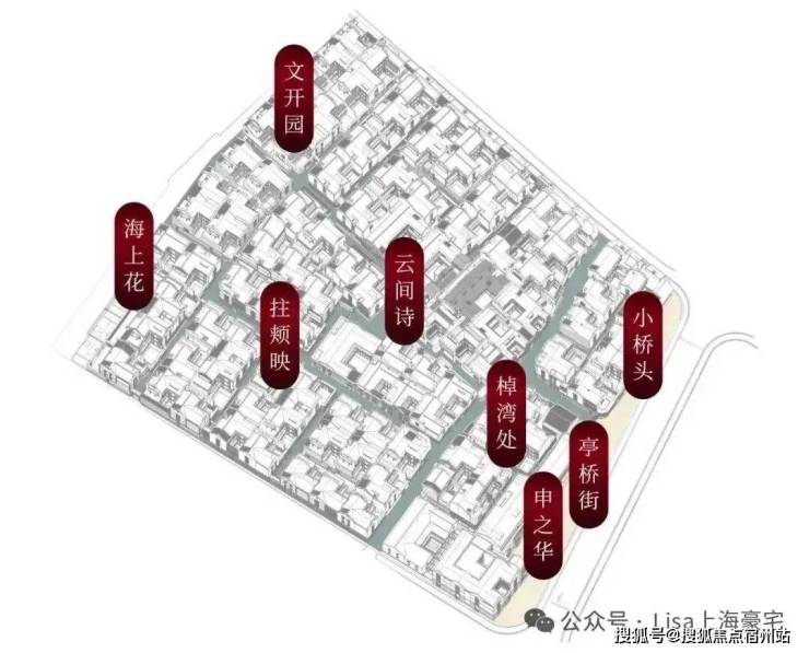 除了宅院,士林润园还通过“润园八景”的设计,把上海深厚的历史和文化融入每一寸空间。拄颊映、文开园、亭桥街、棹湾处、云间诗、申之华、海上花、小桥头,这些景观设计基于上海历史文化中的典故和逸事。
