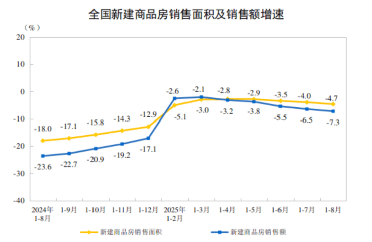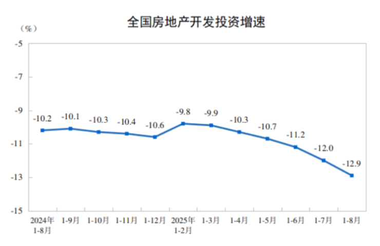 1、房地产开发投资情况。今年1—8月,全国房地产开发投资额为6.03万亿元,同比下降12.9%;其中,住宅开发投资额4.64万亿元,同比下降11.9%。