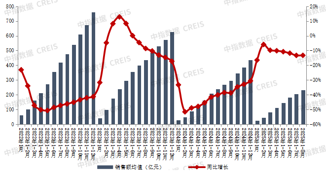 3、百强房企销售情况。据中指研究院数据统计,2025年1—8月中国TOP100房企销售总额为23270.5亿元,同比下降13.3%,降幅与1-7月持平。
