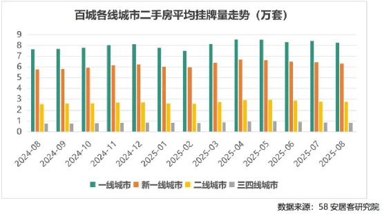 4、全国商品住宅挂牌量。据安居客研究院数据,今年8月百城二手房挂牌量254.64万套,同比增长9.69%;其中一线城市增加7.50%;新一线城市增加10.27%二线城市增加8.66%;三、四线城市增加12.10%。