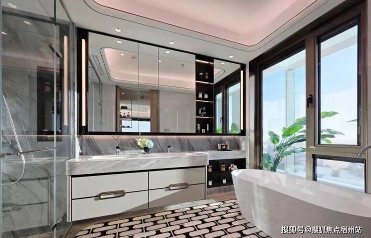 这是125㎡样板间的“女神卫浴”空间,专门利用镜面光、顶光、侧边光墙打造了一个协同光域场,让你站在镜前不会感到传统光源的刺眼,光线均匀柔和洒下,让你在梳妆时每个细节都纤毫毕现。
