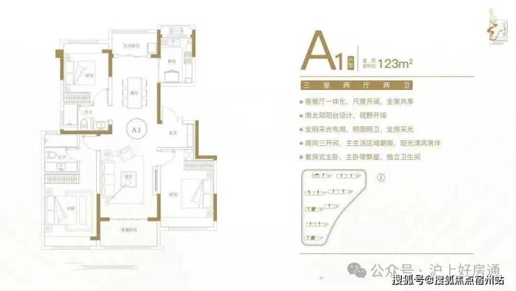 建面约123㎡三室两厅两卫户型特点:客餐厅一体化,尺度开阔,全家共享;南北双阳台设计,视野开阔;全明采光布局,明厨明卫,全房采光;南向三开间,主生活区域朝南,阳光清风常伴;套房式主卧,主卧带飘窗,独立卫生间。