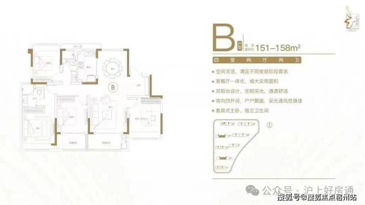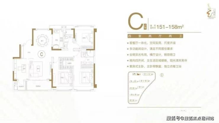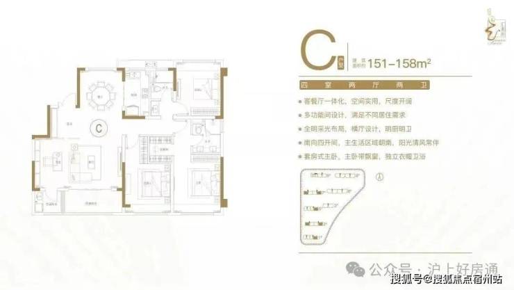 建面约151-158㎡四室两厅两卫户型特点:客餐厅一体化,空间实用,尺度开阔;多功能间设计,满足不同居住需求;全明采光布局,横厅设计,明厨明卫;南向四开间,主生活区域朝南,阳光清风常伴;套房式主卧,主卧带飘窗,独立衣帽卫。