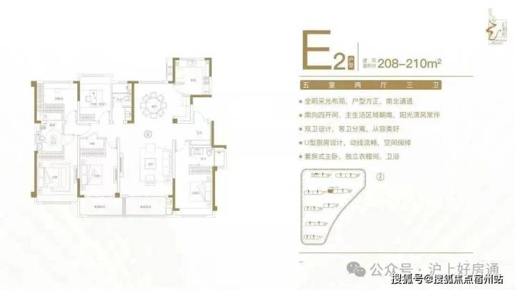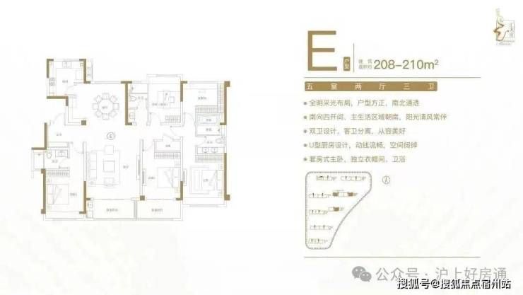 建面约208-210㎡五室两厅三卫户型特点:全明采光布局,户型方正,南北通透;南向四开间,主生活区域朝南,阳光清风常伴;双卫设计,客卫分离,从容美好;U型厨房设计,动线流畅,空间阔绰;套房式主卧,独立衣帽间、卫浴。