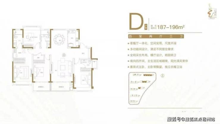 建面约187-196㎡四室两厅三卫户型特点:户型方正,南北通透,动静分区有序;双套房设计,卧室带飘窗,独立卫生间;客餐厅一体化,尺度开阔,全家共享;全明采光布局,告别暗房,明厨明卫;南向四开间,阳光清风常伴。