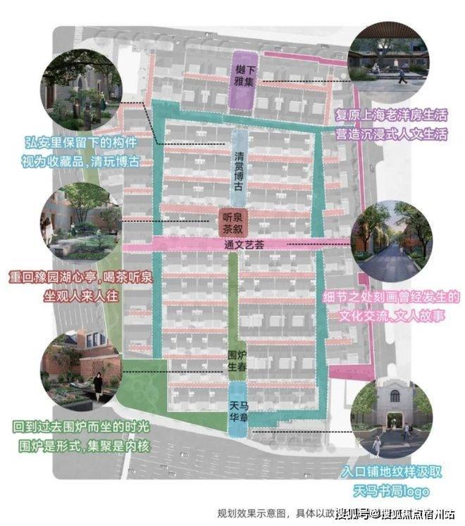 雅集六境:入园俯拾,开启百年天马华章;下沉庭院偶遇交谈,围炉生春;临水而憩,犹如豫园湖心亭听泉茶叙;随心漫步,清赏博古原址老构件;中庭樾下雅集,怀旧洋房的生活趣味;东西主轴的通文艺荟,植入文化故事,围上“人文”腰封。